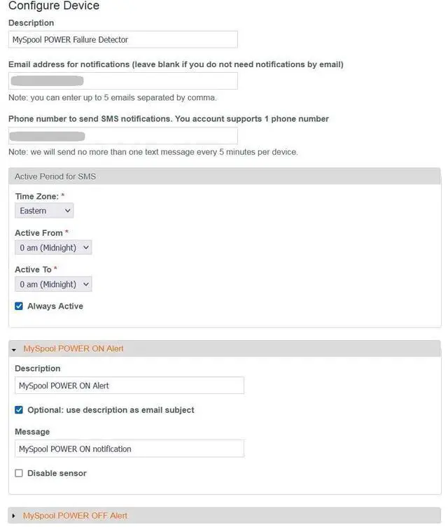 No fees or subscription costs. Multiple phone numbers and email addresses are supported. MySpool devices are designed only to use the internal AAA batteries to send Power OFF notifications. They should last seven or more years, and notices will be sent with reminders and instructions on how to replace them. Never worry about a power failure at your home or business again.