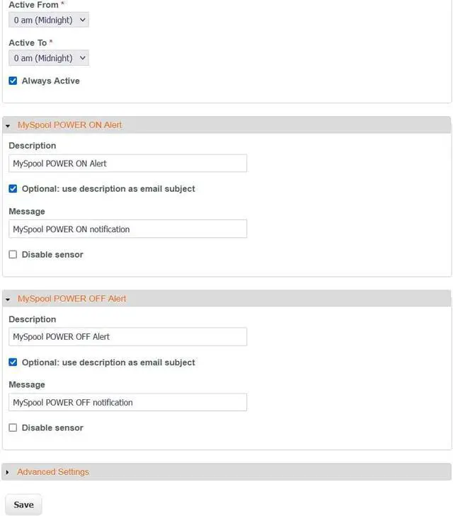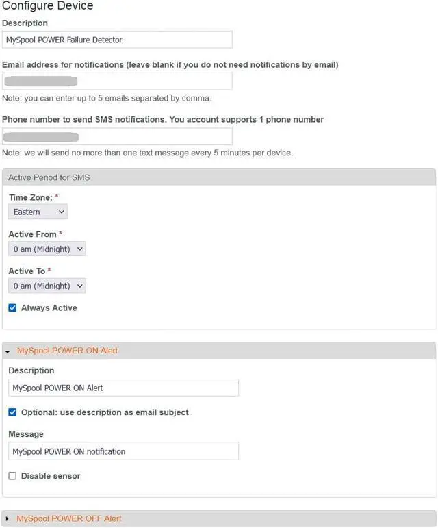A/C powermonitor sends Power ON and Power OFF alerts. Think of these four alerts as independent sensors. They can be configured like all other MySpooldevice alerts, with text messages, multiple email recipients, and allavailable integrations. Up to 360 text message alerts per sensor per year can be sent. Email alerts are unlimited.
