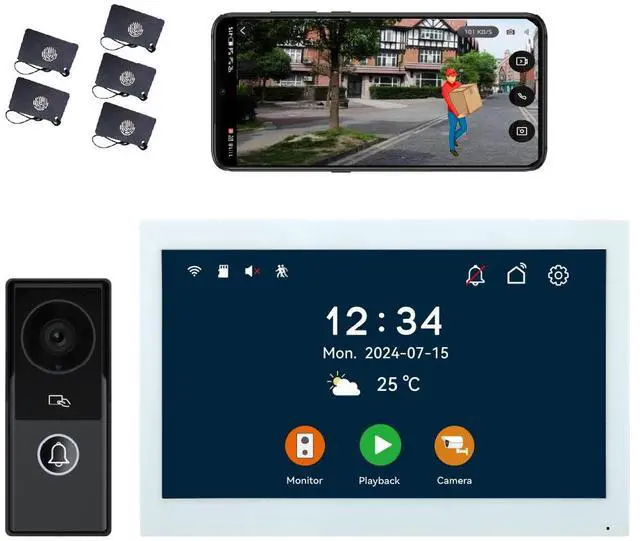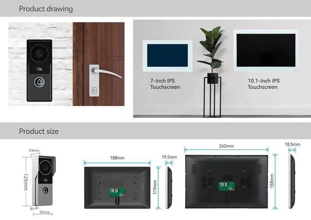 1080P 2MP HD Camera&Touch Screen Monitor7/10-inch TFT touch monitor with slim design, support APP "Tuya Smart" or "Smart Life" wireless WiFi, intercom hand-free. The wifi video doorbell intercom system has 1080P HD camera, 155° wide angle, with rain cover build-in speakers and microphone, built-in infrared sensor, IR night vision, rainproof, dustproof and anti-vandalism.