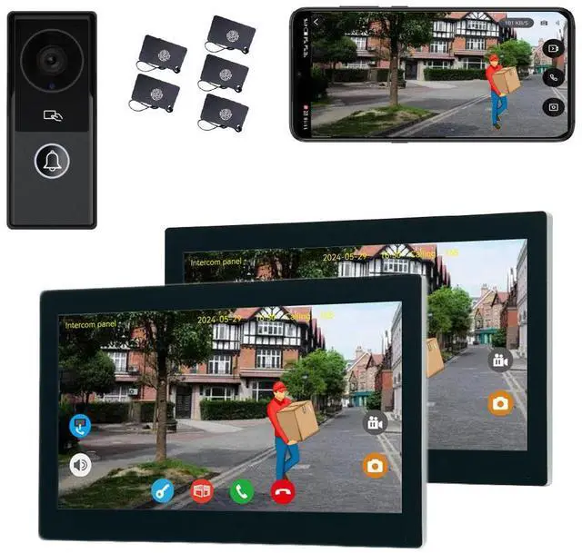 • 1080P 2MP HD Camera&Touch Screen Monitor7/10-inch TFT touch monitor with slim design, support APP "Tuya Smart" or "Smart Life" wireless WiFi, intercom hand-free.The wifi video doorbell intercom system has 1080P HD camera, 155° wide angle, with rain cover build-in speakers and microphone, built-in infrared sensor, IR night vision, rainproof, dustproof and anti-vandalism.