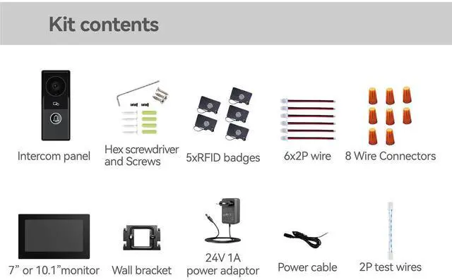1080P 2MP HD Camera&Touch Screen Monitor7/10-inch TFT touch monitor with slim design, support APP "Tuya Smart" or "Smart Life" wireless WiFi, intercom hand-free. The wifi video doorbell intercom system has 1080P HD camera, 155° wide angle, with rain cover build-in speakers and microphone, built-in infrared sensor, IR night vision, rainproof, dustproof and anti-vandalism.