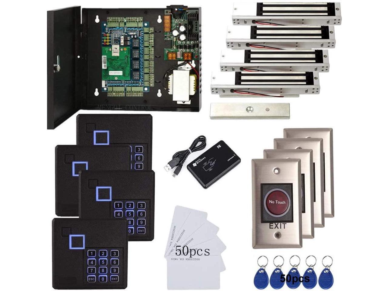 4 Doors Access Control System Infrared No Touch Exit Keypad Scanner 600lbs Electric Magnetic Lock 110V Metal Power Box RFID Reader RFID Card Key Fob(Phone APP remotely Open Door)
