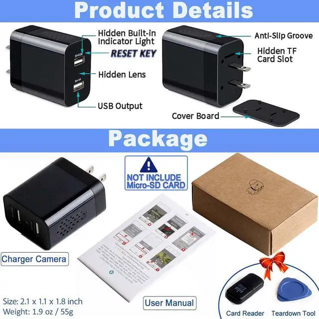- - This powerful hidden camera charger has push notifications. You get a real-time message on your cellphone if it detects motions. H. 264 performance and 128GB micro SD Card (not included) can hold videos for up to 15 days. And Surge Multi-Protection saves SD cards from corruption.