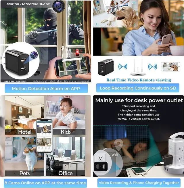 % The camera Lens is hidden between two USB port slots, It looks like a regular phone charger, there is no indicator and no sound when recording, No one will know this is a spy hidden camera. You can confidently plug it into your home, office, hotel, store, or even nursing home.