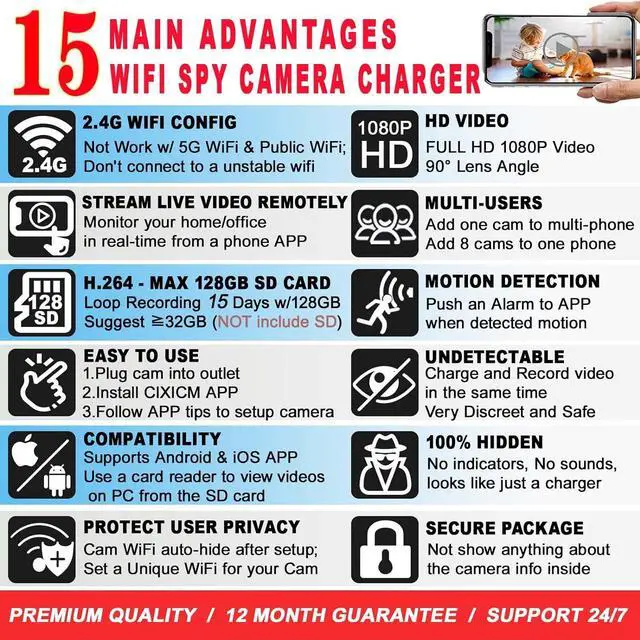 - - This powerful hidden camera charger has push notifications. You get a real-time message on your cellphone if it detects motions. H. 264 performance and 128GB micro SD Card (not included) can hold videos for up to 15 days. And Surge Multi-Protection saves SD cards from corruption.