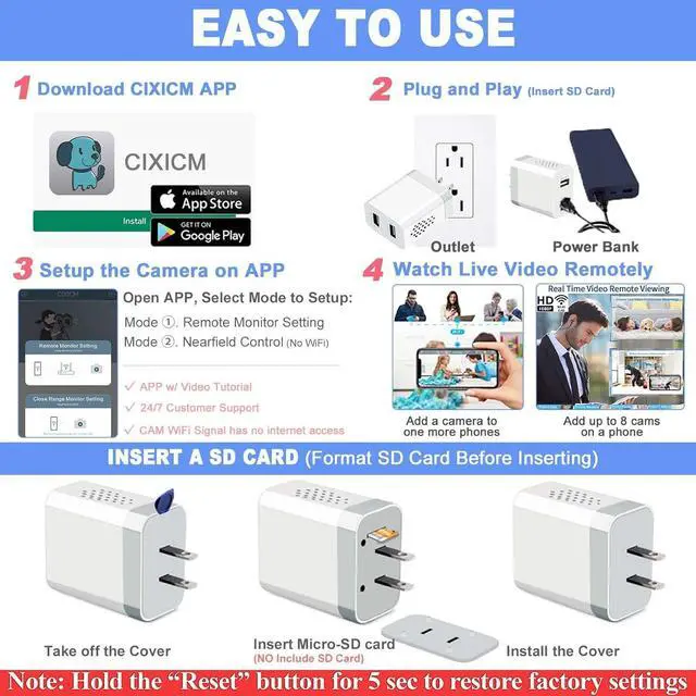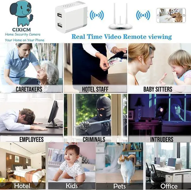 & - Just plug your wifi spy camera into an outlet or power bank, download our free App from AppStore or PlayStore, and connect it to your 2.4G router WIFI, Monitor your home, office in real-time on your phone no matter where you are, with clear 1080P Full HD video. [Only COMPATIBLY with 2.4GH z WiFi, NOT 5GHz. ---].