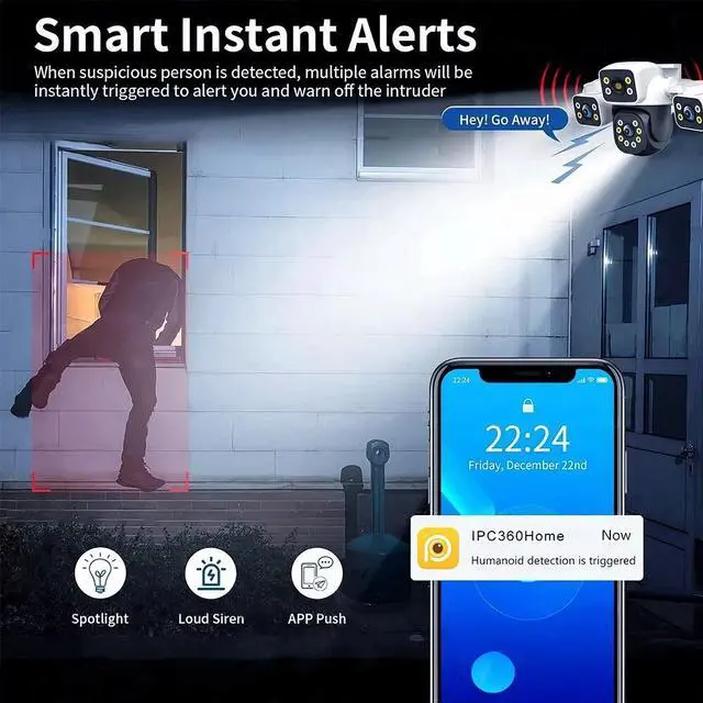 Round Protection: This outdoor security camera comes with two fixed lenses and one pan & tilt lens, enabling to simultaneously monitor three different areas; Easily control the ptz camera to pan 315°and tilt 90°through the app, while two fixed cameras support 355° horizontal and vertical rotation (manually), it provides full protection for your home and property.