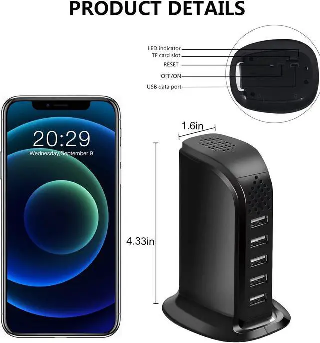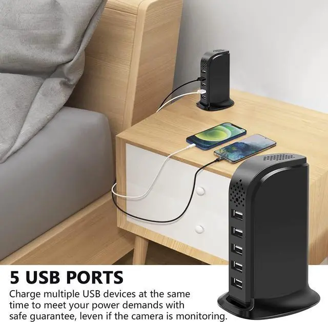 Spy Camera with 5 PortsThis hidden camera has 5 ports to charge your mobile phone, power bank, laptop and other devices. It just looks like a charger, so you can place it on your desk, by your bed, or anywhere, and no one will suspect it is a spy camera.