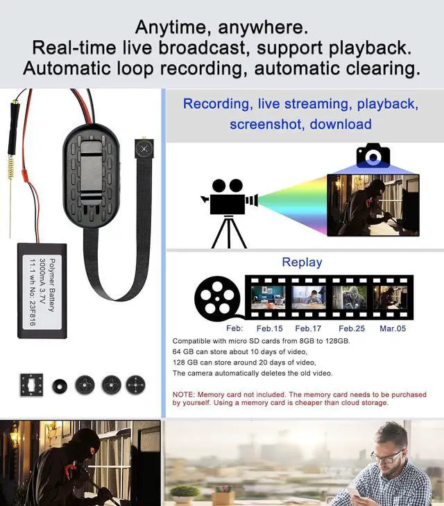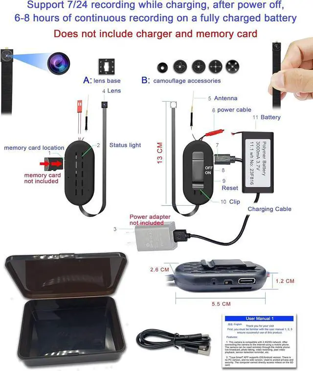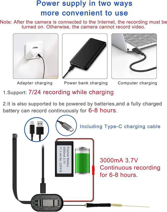 3. The camera supports 7/24 recording while charging. Also supports recording 6-8 hours powered by battery. Power status light: After the camera is connected to the power supply and turned ON, after about 2 minutes, the status light will appear in two situations: The first situation is that the blue light flashes quickly (about 2-3 times per second), you can use the mobile phone and camera to connect to WIFI, and follow the steps in the manual.