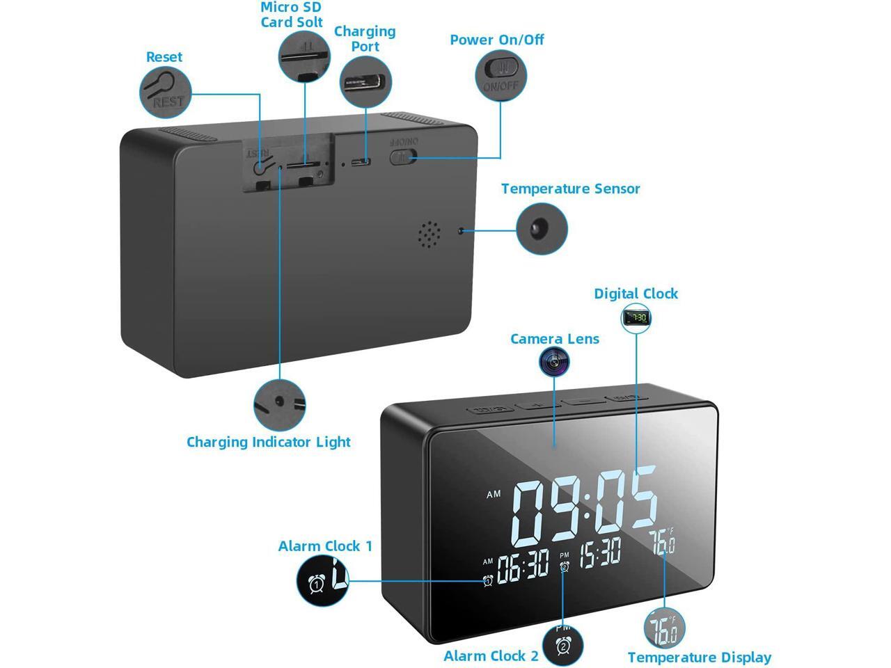 Hidden Camera Alarm Clock (Card Not Included)- The spy camera sits concealed in what will appear like a normal digital clock. And because clocks are so common, you can place this device virtually anywhere in your home or office. No one will suspect that this ordinary alarm clock is actually wireless wifi hidden camera