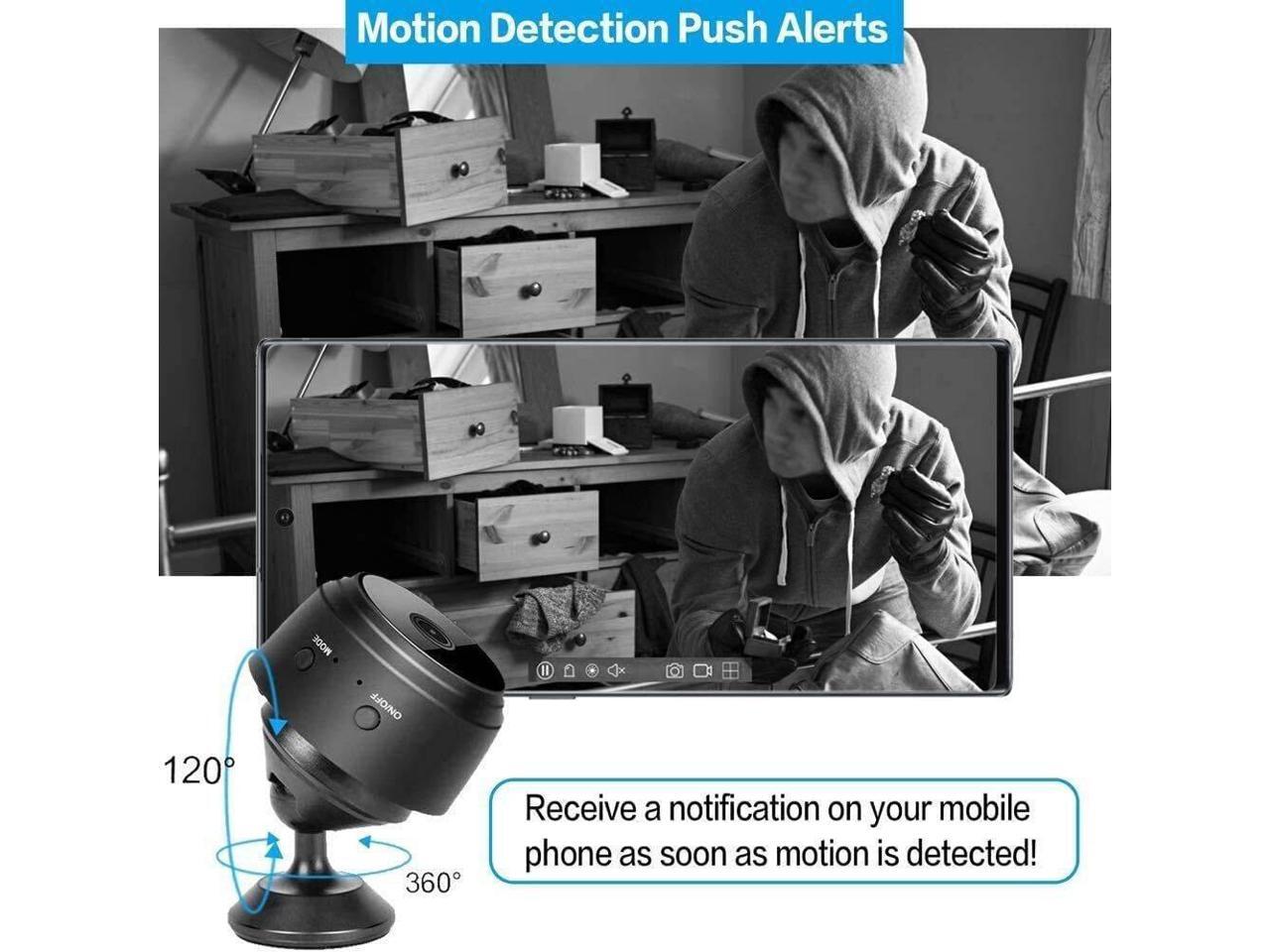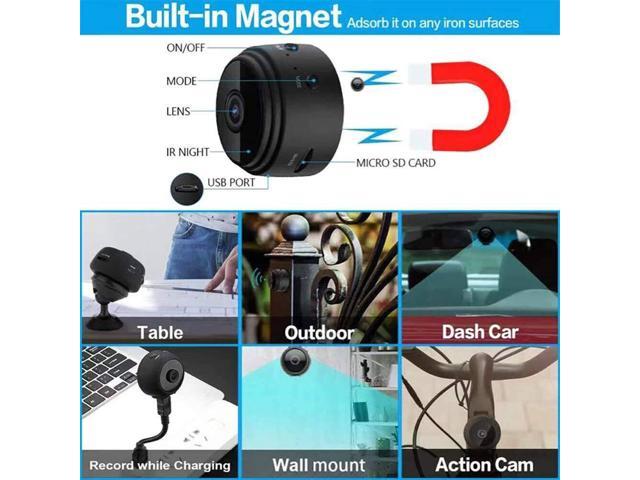 - Built-in Magnet This small camera bathroom has a built-in magnet, can work well with any iron material, easily place anywhere. This small camera with a rigid charging cable and magic base, when charging while recording, you can manually rotate the recording angle 360 degrees.