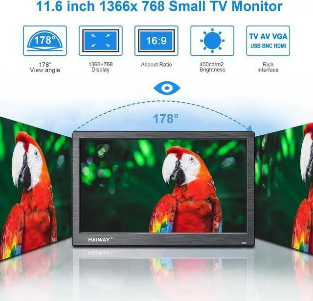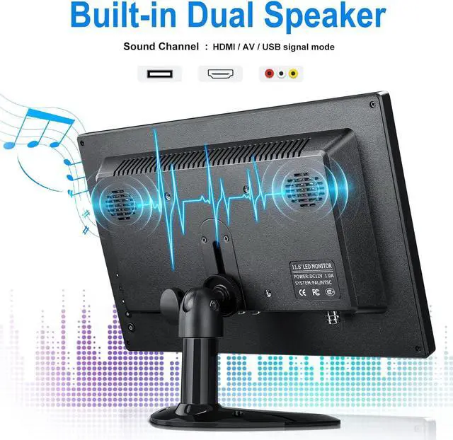 This mini monitor is slim and lightweight, with a variety of convenient designs. Button design makes the operation more convenient; you can also use the remote control to real-time control this monitor. Multi-language OSD menu can complete various settings, such as Brightness, Clarity, Language...; Built-in dual speakers that can produce the best sound available, which is solid and great for watching shows with others.