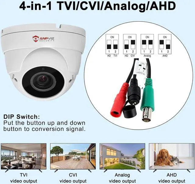 This security camera supports 5MP HD-TVI, CVI, AHD and 960H CVBS. Video format can be switched according to your DVR type. It requires a 5MP and 8MP 4K DVR recorder. Can not be used stand alone.