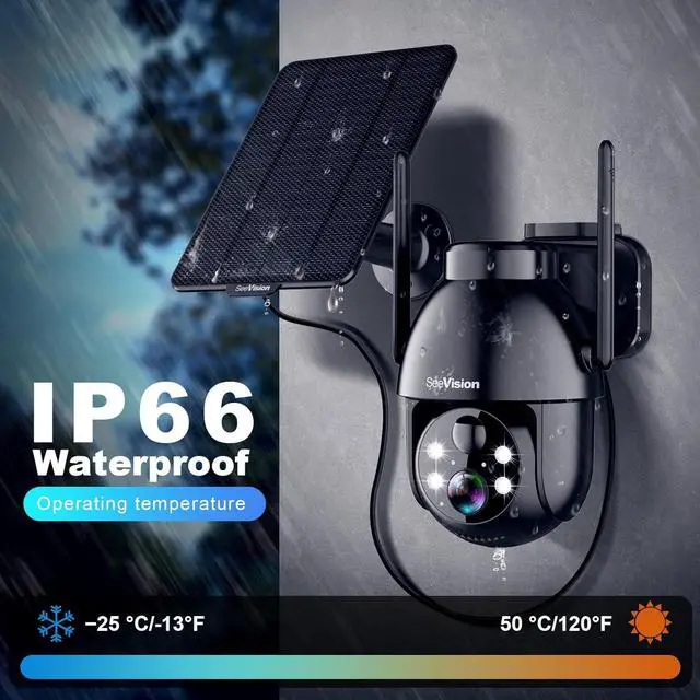 Solar Powered, Rechargeable, Waterproof and Wire-FreeThis solar security cameras wireless outdoor/indoor camera has a 5200mah battery built in to provide continuous power for wireless outside cameras with high conversion rate solar panels. The wifi security camera outdoor with IP66 waterproof can work in any weather. Since the WIFI cam is completely wireless, no power cords or network cable is needed, the installation is very simple, allowing install anywhere though the provided, bracket and screw.