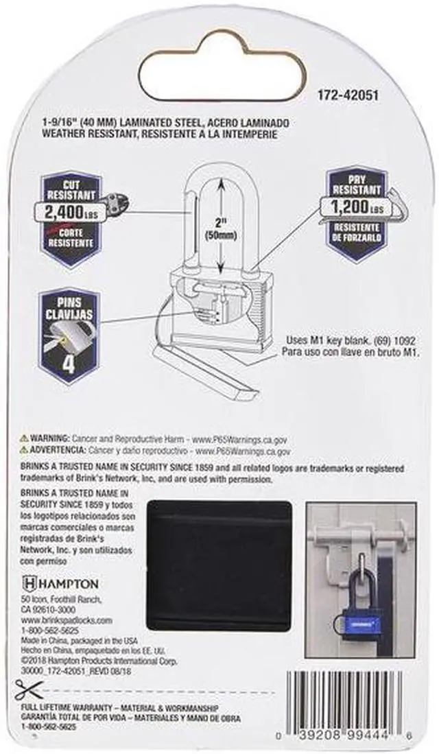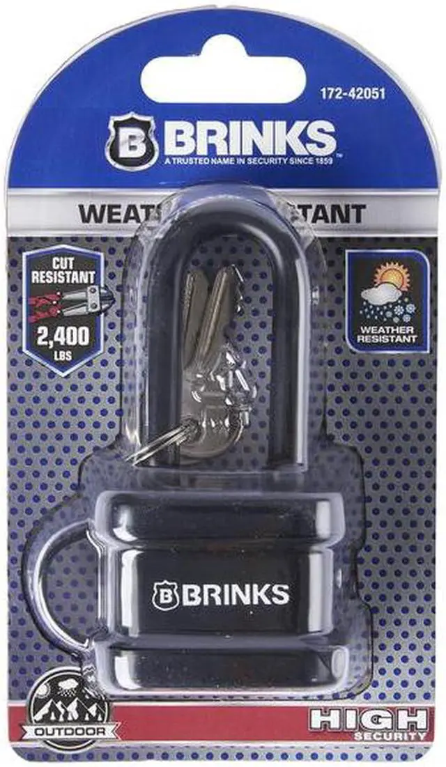 California Proposition 65: This product contains a chemical known to the State of California to cause cancer. California Proposition 65: This product contains a chemical known to the State of California to cause birth defects or other reproductive harm.Brinks Weather Resistant Padlock features a laminated steel 40mm body with a chrome plated, hardened steel shackle wrapped in vinyl for increased cut resistance. The padlock is equipped with brass 4-pin tumbler, dual lever locking mechanism for pick and pry resistance and a key cylinder cover to keep dirt and grime out for long lasting performance. The padlock can be use indoors or outdoors. With its superior corrosion resistance, it is perfect for use in any wet climate and the harshest environments. The padlock is ideal to use to secure doors, gates, sheds, trailers, storages, chains and other items subjected to the elements.