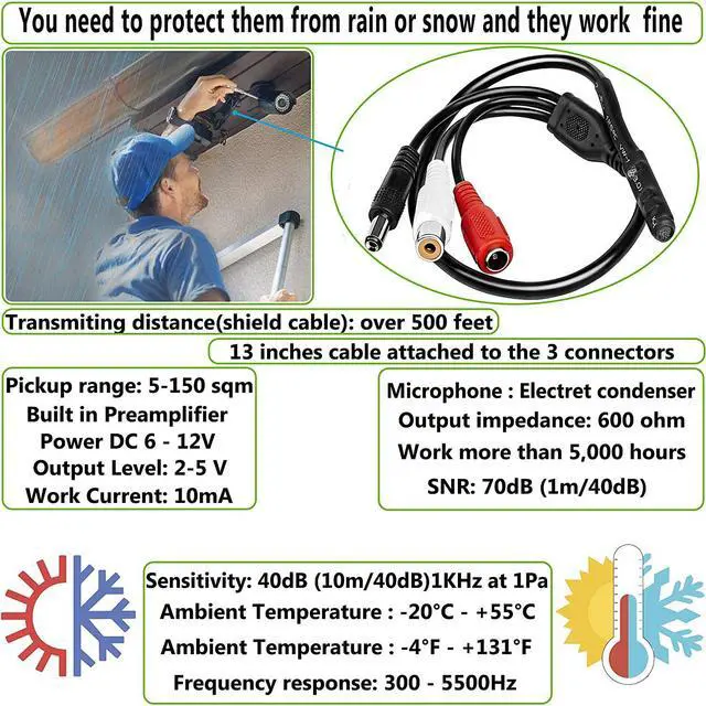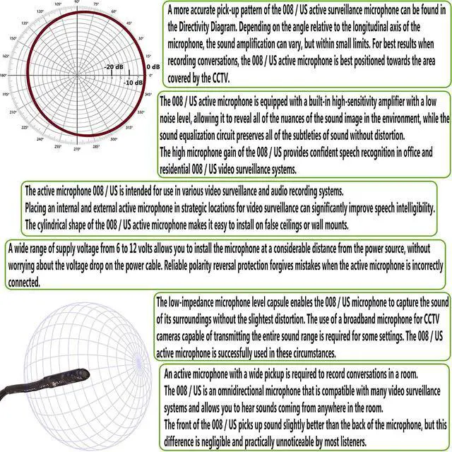 SURVEILLANCE MICROPHONE HAS High gain and auto level adjustment + sensitivity adjustment. Qualitative elements and the modern design of the microphone make it the leader in the US market.