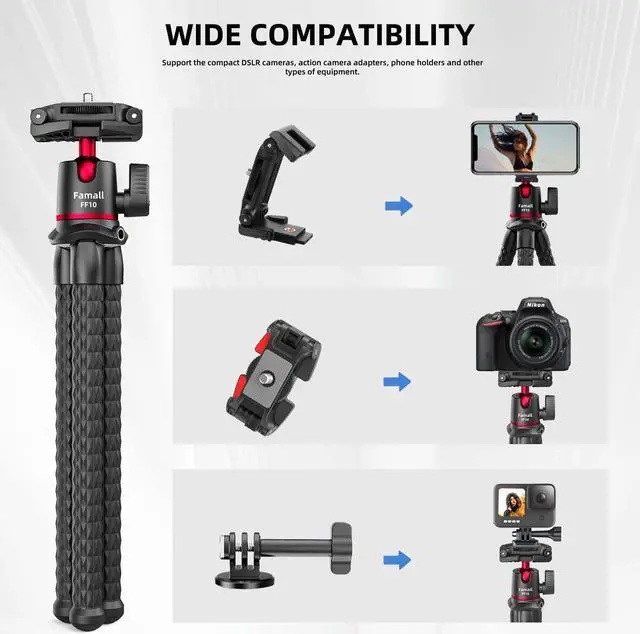Wide CompatibilityUniversal 1/4 screw fits most brand of camera, such as Nikon/Canon/Sony. The phone clip can be expanded between 65-95mm compatible with different size smart phones.