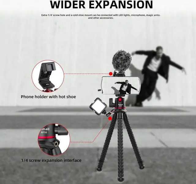 Cold shoe &Extended 1/4 threadPhone mount with cold shoe for microphone and light, perfect for vlog or live. The flexible camera tripod for camera has a 1/4 thread can be apply to magic arm achieve more requirements. A 1/4" threaded mounting point at the side enables you to connect a LED light panel, or a strobe for improved shooting quality.