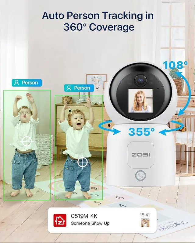 [Smart Detection and Human Tracking] Equipped with an AI-powered detection algorithm, ZOSI 4K indoor WiFi camera accurately identifies any motion or the presence of humans, babies, or pets. Receive instant alert notifications on your phone and ensure that the camera's automatic tracking function keeps any human movement within the monitoring area in focus at all times. [ 2.4 /5GHz Dual Band WiFi] ZOSI 4K WiFi camera supports both 2.4GH z and 5GHz dual-band WiFi for a stronger and more reliable connection. Simply follow the step-by-step instructions on the app to quickly establish a wireless internet connection.