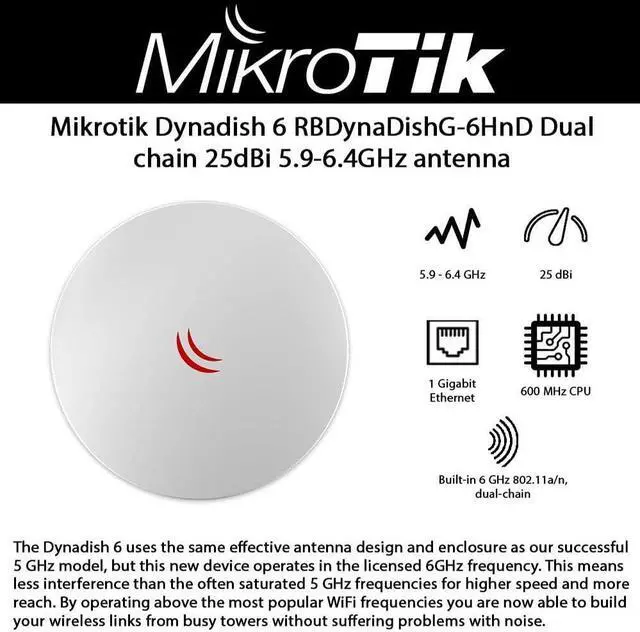 The Dynadish 6 uses the same effective antenna design and enclosure as our successful 5 GHz model, but this new device operates in the licensed 6GHz frequency. This means less interference than the often saturated 5 GHz frequencies for higher speed and more reach. By operating above the most popular WiFi frequencies you are now able to build your wireless links from busy towers without suffering problems with noise. It is a simple and completely integrated product with everything you need to quickly install a reliable point to point link. This product is not suitable for unlicensed ISM bands. Device use is subject to country regulations. Availability might be limited depending on distributor stock and country regulations.