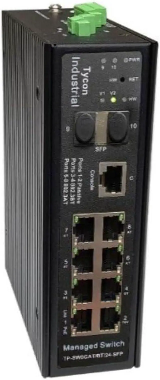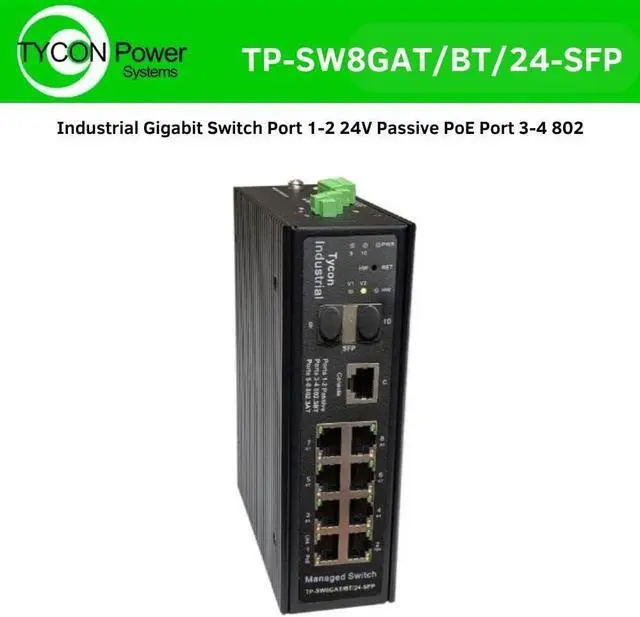 The TP-SW8GAT/BT/24-SFP Power over Ethernet (PoE) 10 port Gigabit switches offered by Tycon® are fully automatic high speed Layer 2+ Ethernet manageable switches. The switch has user configurable PoE ports to provide 802.3AT, 802.3BT and Passive 24V PoE which enables powering different devices from the same PoE Switch. Its two 1Gb SFP fiber ports accept standard single mode or multimode fiber transceivers.