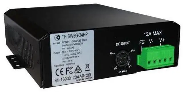 The TP-SW5G-24HP Power Over Ethernet (POE) 10/100/1000Mb switch offered by Tycon Power Systems is a fully automatic high speed 5 port Ethernet switch with up to 35 Watts of POE power per port 140W Max Total. It complies with the IEEE802.3af/at specifications for valid POE device detection. The unit supplies power to the remote device on the unused Ethernet pins 4,5(V+) and 7,8(V-). The Ethernet spec supports distances up to 100m (328 feet) between the POE switch and the remote device. The switch accepts DC power from 12-36VDC which makes it an excellent choice for those systems powered by battery power. There are 2 power inputs for attachment of primary and backup power sources. It also accepts 802.3af or 802.3at power thru port 5. Applications Wireless Access Points and Client Devices IP Phone and Security Camera Systems