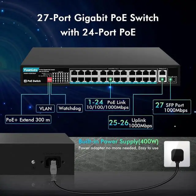 AI Extend 300m PoE Watchdog Port-Based VLAN Full Gigabit Port Auto Detects Power Devices Fanless & Silent Operation 4KV Lightning Protection Rack Mount Design Plug And Play