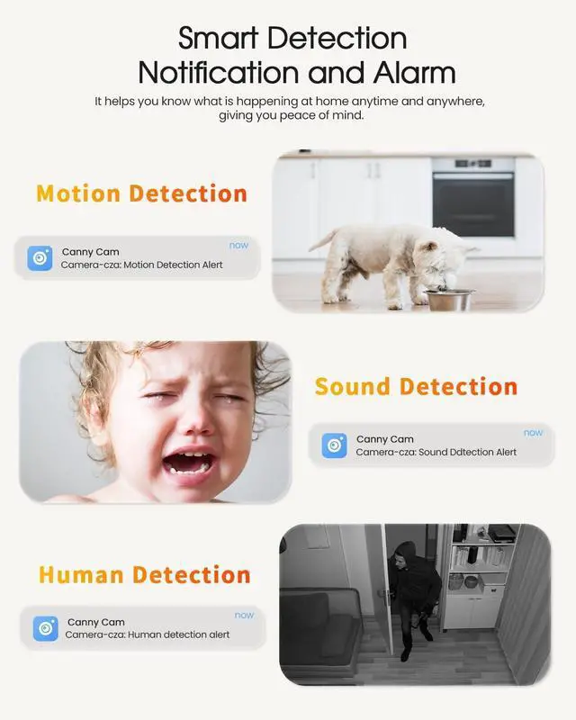 Detection Alarm: If you are away from home, turn on the detection alarm. When motion is detected, the indoor camera will sound an alarm to ward off uninvited guests and send you an instant notification of what' s happening in your home in real-time, indoor security camera.