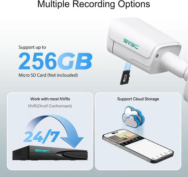 Multiple Recording Methods & Support Phone, PC, and iPad This SV3C POE camera supports up to 256G SD card and 24/7 all-day recording, alarm recording as well as video playback. It also supports NVR and cloud storage! And This SV3C POE camera works with mobile phone, PC and iPad. So you can choose multiple recording and connection methods! If you have any question about the security poe camera, please feel free to contact SV3C by your order.