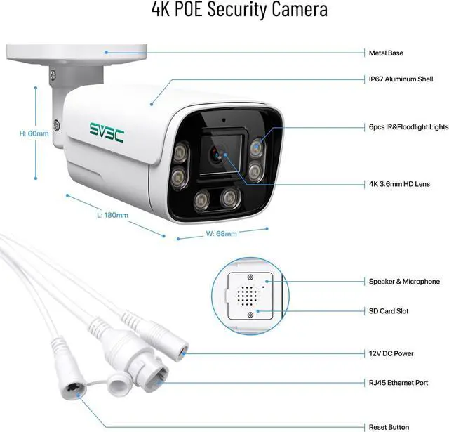 4K Ultra HD Image & 120° Wide AngleWant to watch sharp and crisp videos in real time? Or want to look wider? Try this SV3C 4K (8MP) POE IP Camera! This poe ip camera delivers almost 4 times the clarity of 1080p. With the ability to capture 4K@20fps, 120° wide angle, this poe ip camera can present HD videos for you and allow you to see more.