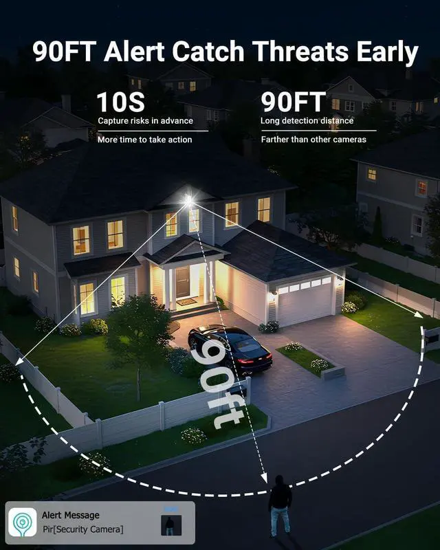 [24/7 Continuous Recording]The camera for home security records at a rate of one frame every two seconds during standby mode and switches to 25 frames per second when People or Car is detected, ensuring uninterrupted 24-hour recording. It features both infrared night vision and color night vision, enhanced by five upgraded LED spotlights, providing round-the-clock protection from day to night