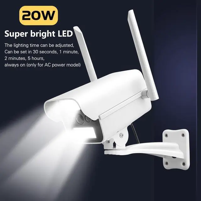 Motion Sensor Light&Audio& Sound&DoorbellThe dummy security camera outdoor is equipped with 20W ultra-high brightness LED, when the radar detects the target, the fake outdoor security camera LED will light up, the effective lighting range can reach 650-850 Square foot, can be used as an a solar security lights outdoor and motion sensor led garage light&stair lights&hallway light, motion sensor night light, home security systems, Commercial Door Entry Alert, Entrance Welcome Doorbell.