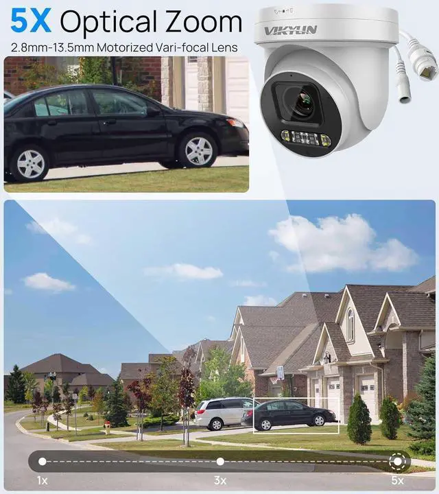 UltraHD 4K PTZ 5XOptical Zoom: 8MP@20fps 60@FPS(1920×1080)resolution featuring the latest 1/ 2.8 " IMX415 CMOS, come with 2 warm lights and 2 IR leds illumination can be captured clear images in low light or total darkness, up to 132ft ultralong night vision distance; high speed Dome with Pan 0° to 275°/Tilt 0° to 90° to cover a much bigger vision range, 2.7 - 13.5 mm Motorized Lens enables you to zoom into see more details of far-away objects without impairing image quality