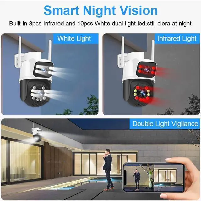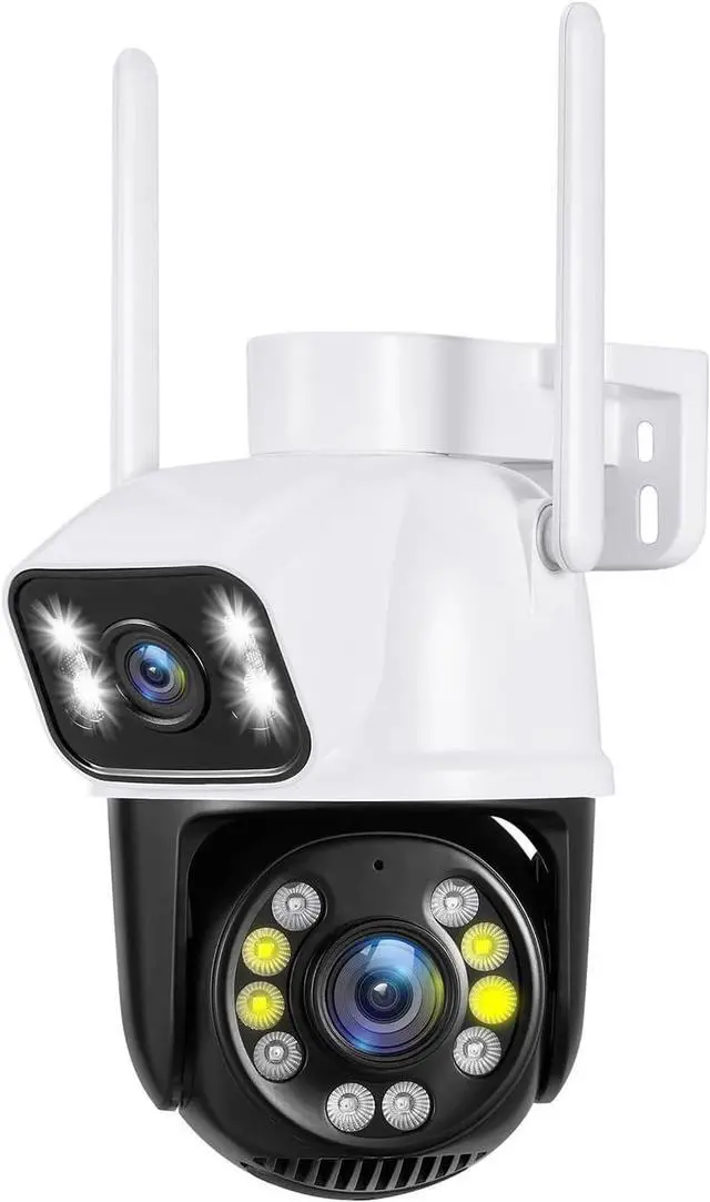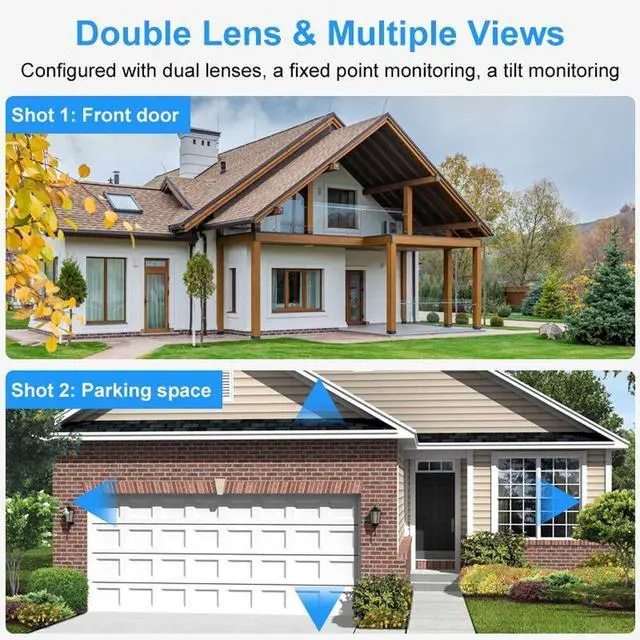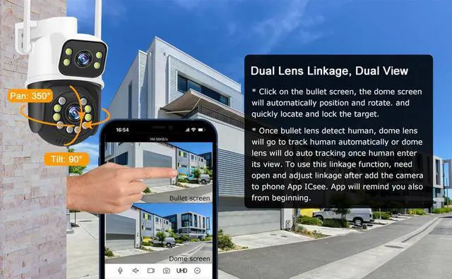 AI motion detection, Dual Lens LinkageThis smart home security cameras wireless outdoo is built in AI algorithm, triggered by human motion, avoid false alerts from waving leaves, flies, dust, light changing, etc. Once Wifi wireless security camera detects a human motion, it will track the target until it is out of view, and return to default point. Dual Lens display in APP, the upper is fixed lens and the lower is PTZ. Touch a point on the bullet screen, the PTZ lens will quickly locate & lock it.