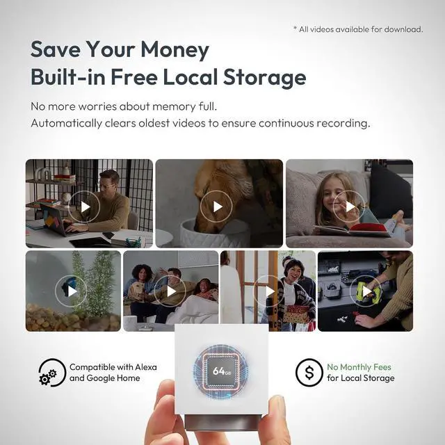 Subscription-Free Local Storage: Choose 32GB or 64GB local storage to keep your data safe without monthly fees or extra SD cards. Enjoy 14-30 days of on-device storage and lifetime alarm push notifications for a cost-free experience