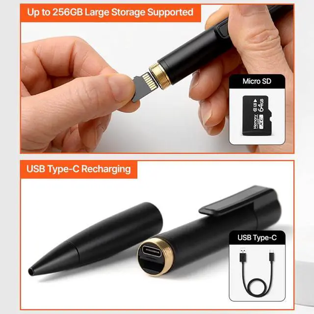 [All-in-One Accessory Set] Includes USB-C charging cable, two refillable pen cartridges, a 64GB SD card, pen holder, and stand offering maximum portability, convenience, and long-term usability for your hidden camera pen