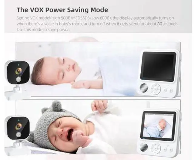 Setting VOx model(High 50DB/MED55DB/Low 60DB), the display automatically turns onwhen there's a voice in baby's room, and turn off when it gets silent for about 30seconds.Use this mode to save power.