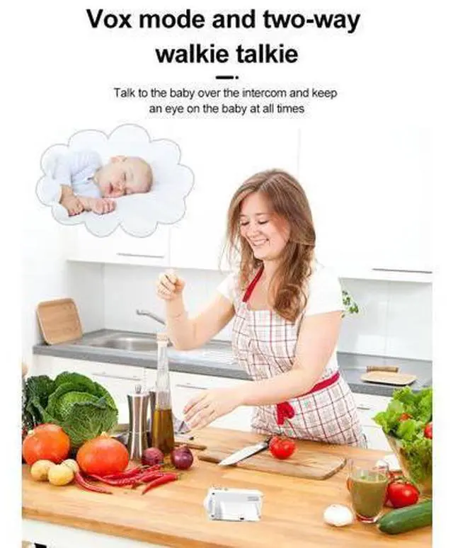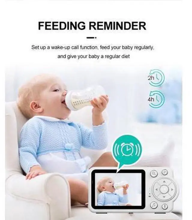 1. 2.8-inch baby monitor + remote monitoring + IPC camera2-way simplex communication, temperature detectionalarm, crying sound alarm, video magnification function3 Lullaby playback, volume adjustment function, feeding reminder function4.2-inch TFT high-definition screen, screen brightness adjustment,power-saving function when screen is off. 530W high-definition camera,can be manually rotated 360° left and right, 55° up and down. No red lightfor night vision.