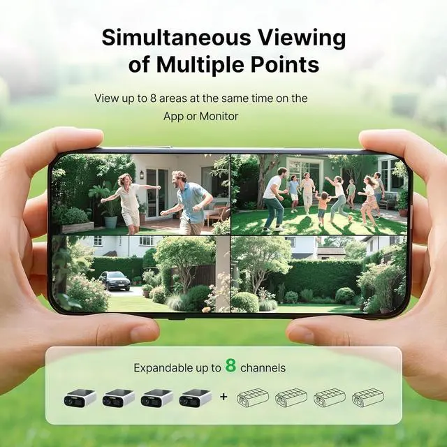 • Simultaneous Multi-View Monitoring: Keep an eye on everything that matters at once. With multi-point viewing, you can monitor up to 8 areas simultaneously on the app o0r displayideal for large properties, driveways, or multiple entry points. Stay in control and never miss a moment, no matter where you are.