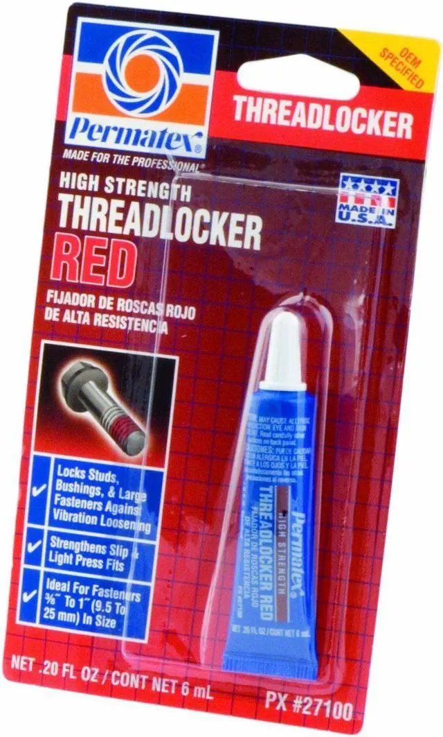 OEM specified. High strength threadlocker for heavy-duty applications 3/8 inch to 1 inch (10mm to 25mm). Especially well-suited for permanently locking studs and press fits. Adds 3,000 PSI holding power on slip and press fit assemblies. Replaces set screws and snap rings. Locks against vibration loosening. May require heat or special tools for removal. Conforms to ASTM D5363 AN0221 (Mil-S- 46163A, Type I, Grade K).KEY_TAB