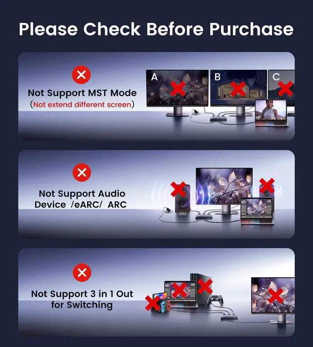 Important Notes Before Purchase: 1. Only mirrors, not extends displays; 2. Doesn't extract audio to external audio devices; 3. Not compatible with ARC/eARC; 4. Supports one input to three outputs, not three inputs to one output.