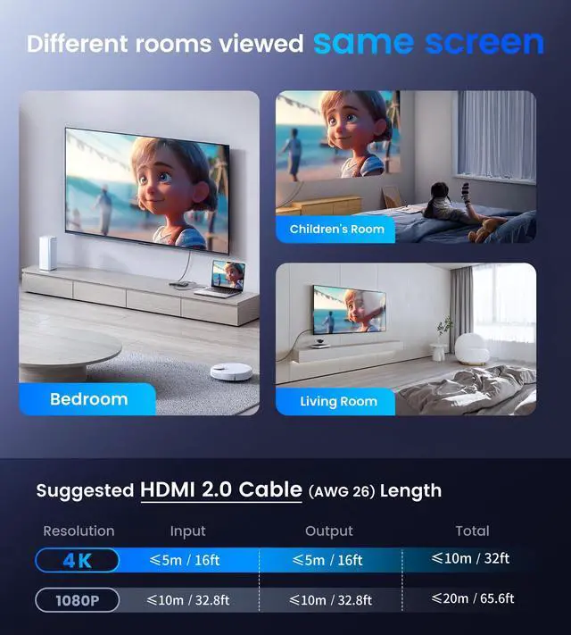4K UHD Visual Experience: Supports 4K@30Hz, 1080P@60Hz, and 3D video with 8/10/12-bit color. Enjoy immersive Dolby True HD and DTS-HD audio. Long-distance HDMI transmission up to 64ft (32ft in/out)stable, reliable, and ready for all your devices.