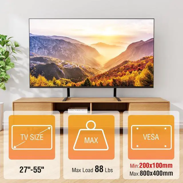 Wide Compatibility - TV stand fits 27"-55" flat/curved screens with VESA from 200x100mm to 800x400mm up to 88 Lbs. Please note the TV mounting holes require at least 200mm horizontally.