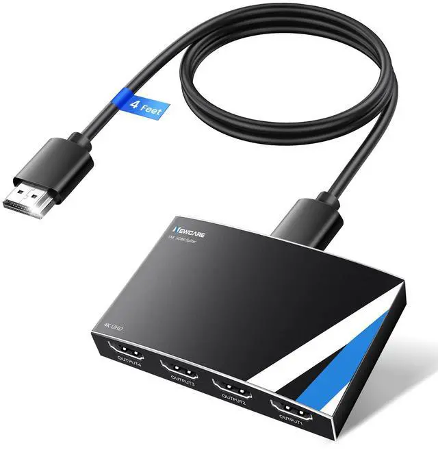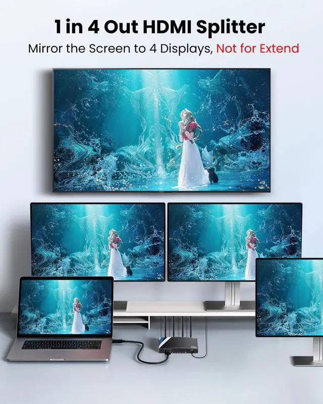 4K HDMI Splitter: This 4 way HDMI splitter can duplicate/mirror one source screen to 4 HDMI display devices, allowing you to sync up to 4 monitors from a single source! The 1 in 4 out HDMI splitter is an efficient tool for managing multiple display synchronization.