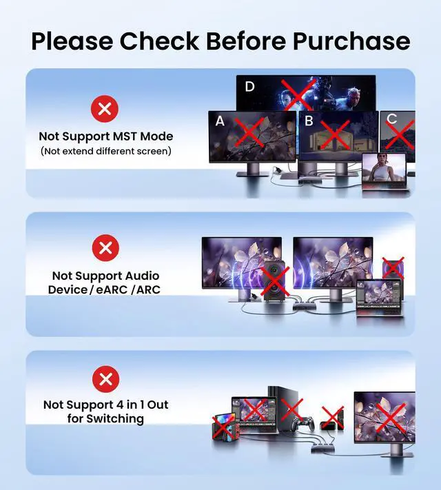 Unavailable Function: This HDMI to HDMI splitter cannot extend display across different screens on monitors; does not support connecting audio devices like speakers or soundbars; not compatible with ARC/eARC; does not support connecting multiple input signal devices as a switcher.