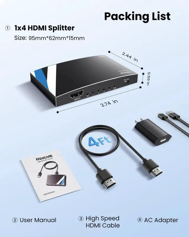 Compatibility: This powered HDMI splitter supports HDMI 1.4/HDCP 1.4 and lower versions; does not support HDMI 2.0/HDCP 2.2 or higher versions; supports one input device like PC, PS5/4/3, fire stick, TV box, or Blu-ray player; output supports HD TV, projector, monitor.