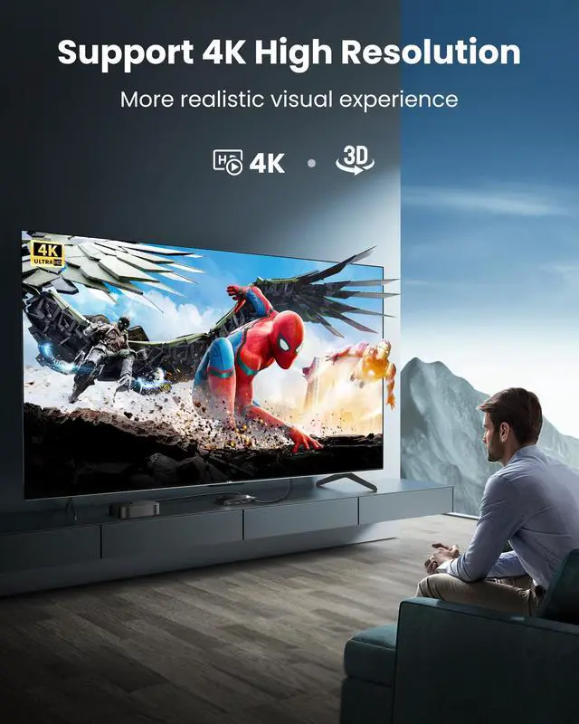 Resolution: This splitter supports UHD 4K@30Hz, FHD 1080P, and 3D; for 1080P, use AWG26 HDMI 2.0 (19+1) cable, input/output length both 32.8 feet; for 4K, use HDMI 2.0 cable, input/output length 16 feet; supports 8/10/12bit deep color, DTS, DTS-HD, Dolby TrueHD, Dolby AC3, DSD, etc.; does not support 4K@60Hz.