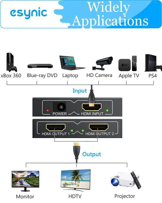 *Widely Compatible*----: This HDMI Splitter for dual monitors is compatible with any HDMI version 1.4/1.3/1.2, supporting input devices such as computers, game consoles, Blu-Ray players, and more. Output devices include HDTVs and HD monitors (Note: Not supported for HDCP).