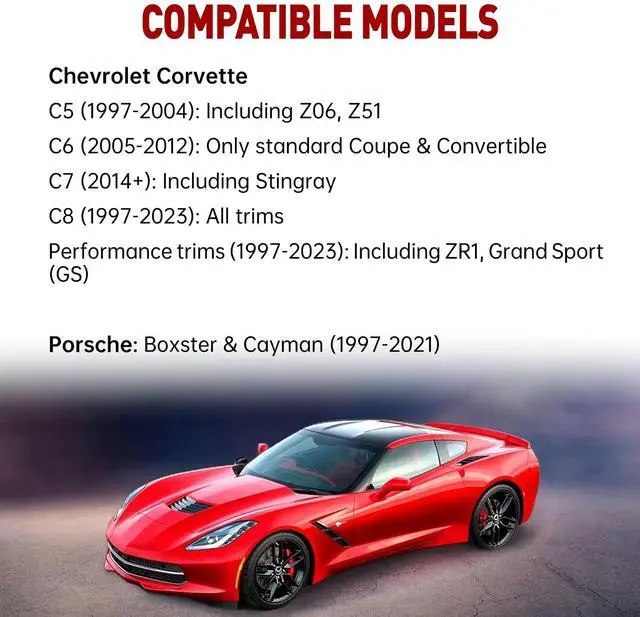 Versatile Usage - The Mapleza Corvette jack pucks are ideal for various uses such as car lifts, jack stands, and floor jacks. They can also be used with off-road jacks, making them a versatile accessory for your Corvette. Compatible Models: Chevrolet Corvette C5 (1997-2004): Including Z06, Z51 C6 (2005-2012): Only standard Coupe & Convertible C7 (2014+): Including Stingray C8 (1997-2023): All trims Performance trims (1997-2023): Including ZR1, Grand Sport (GS) Porsche: Boxster & Cayman (1997-2021)