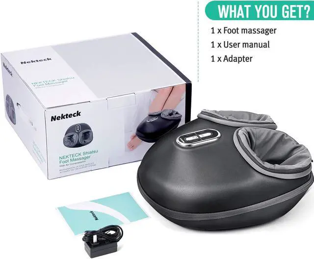 Watt Runtime: 15 Minutes Package Information 1 x Nekteck Foot Massager Machine 1 x UL Listed Power Adapter with 60 inch Power Cord 1 x User Manual Fit Up to Size US-12 Ergonomically designed to fit feet up to Size US -12. It is designed to fit most feet, large space allows men and women to get a great experience in massage.